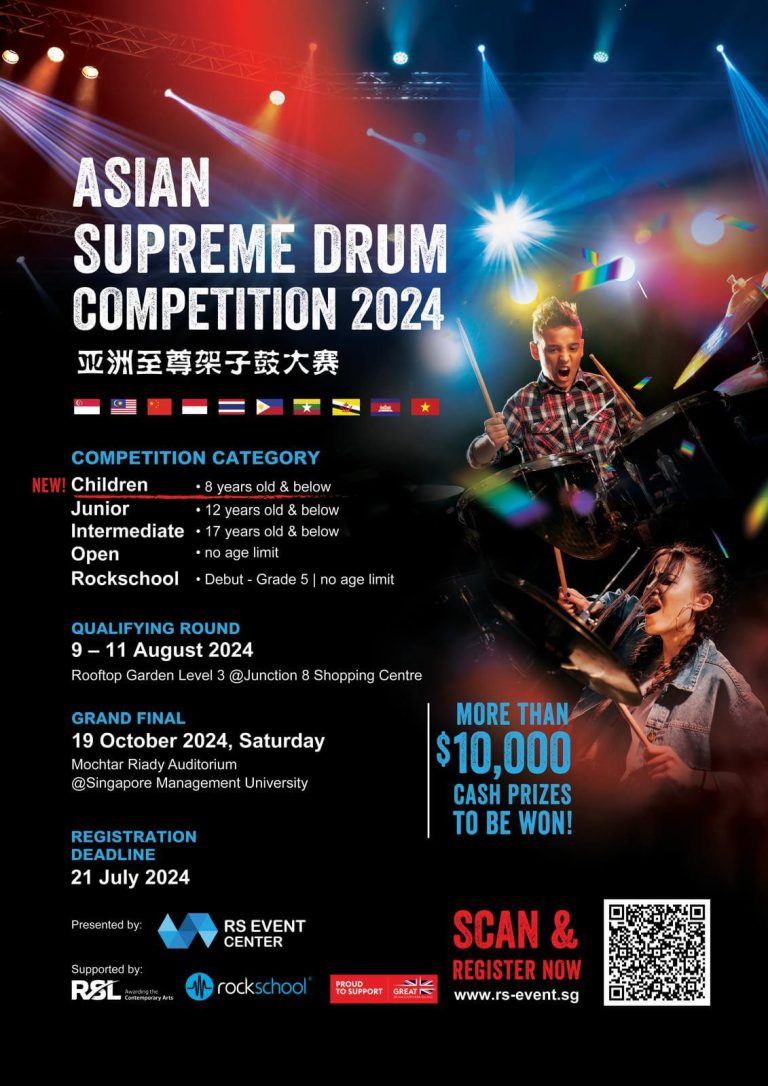Get ready to rock out! The No. 1 drum competition in Southeast Asia is back! The ASIAN SUPREME DRUM COMPETITION 2024 organized by RS Event Center is an annual event dedicated to fostering a love of drumming and lifelong musicianship.