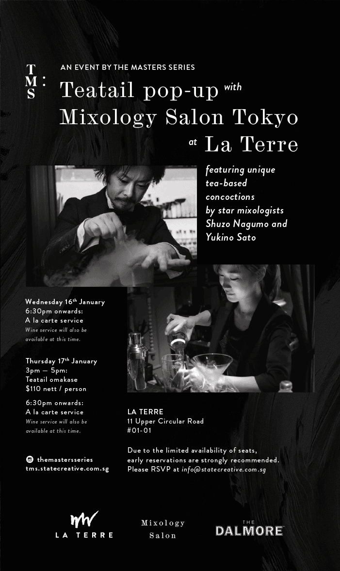 Join us for a two-day Teatail Pop-up event at La Terre wine bar featuring unique tea-based concoctions by Shuzo Nagumo and Yukino Sato from the renown Mixology Salon Tokyo (Asia’s 50 Best Bars 2018).